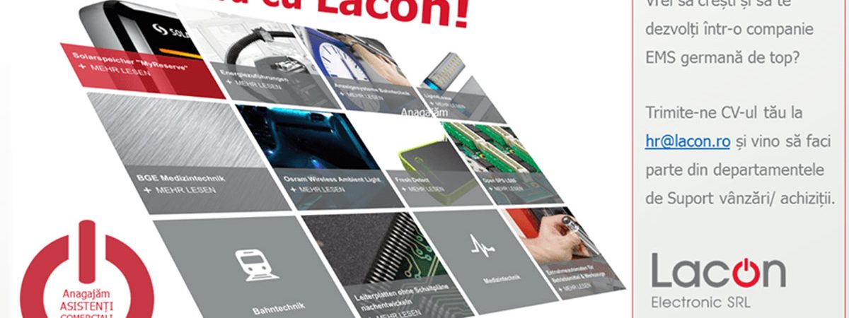 Lacon Electronic SRL este subsidiară a grupului german Lacon, unul dintre cei mai importanți furnizori germani de servicii mecatronice pentru toate industriile. De 12 ani, compania este în permanentă expansiune în România și este în căutare de persoane dedicate și flexibile, pentru o gamă extinsă de posturi entry-level în departamentele de Suport vânzări sau achiziții.
